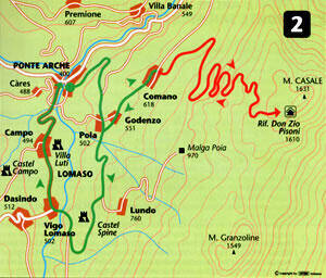 Il percorso Si parte da Ponte Arche (m 400) e si sale verso il paese di Comano (m 618) dove, dopo l’albergo Panoramica, inizia la strada sterrata che Porta al Monte Casale. La salita è lunga, ma non difficoltosa, tranne l’ultimo chilometro che è piuttosto impegnativo. Arrivati ai prati del Monte Casale, dopo circa 1 km, c’è la possibilità di fermarsi al rifugio Don Zio Pisoni (m 1610 – aperto le domeniche estive), godendo di una splendida vista panoramica sulla valle del Sarca, le Valli Giudicarie, l’Adamello e il Brenta. All’inizio dell’estate, inoltre, il Monte Casale (m 1631) offre lo spettacolo di una fioritura di grande valore naturalistico. Faremo ritorno a Comano lungo il medesimo itinerario di salita e da qui proseguiremo per Godendo (m 551) e Poia. Giunti all’incrocio di Poia (m 502) ci dirigeremo verso Lundo dove prenderemo la strada asfaltata per Vigo Lomaso, passando accanto a Caste Spine e da Vigo Lomaso (m 502) ci dirigeremo, su strada asfaltata, verso Ponte arche (m 400). A Vigo Lomaso merita una visita l’antica pieve di S.Lorenzo, situata su un colle da cui domina l’abitato. E’ la chiesa più antica dell’intera vallata, ricordata per la prima volta in un documento del 1205, la cui origine è però anteriore, come dimostrano numerosi ritrovamenti archeologici