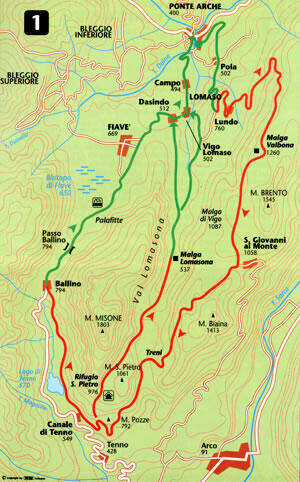 Il percorso Ci si dirige da Ponte Arche (m 400) verso Lundo (m 760), dove dopo il centro abitato inizia la strada sterrata che, salendo per circa 6 km, ci porterà a Malga Valbona (m 1260); la strada, ora in discesa, inizierà dopo qualche centinaio di metri a salire per lo strappo finale, seguito da una discesa che ci porterà al paese di S.Giovanni al Monte (m 1058). Qui gireremo a destra e poco dopo troveremo il bivio che ci porterebbe alla Malga di Vigo e quindi al paese per tornare alla partenza. Noi, seguendo sempre la strada, proseguiremo verso S.Pietro; brevi salite si alternano a delle discese con dei tratti abbastanza ripidi. Dopo la località Treni si troveranno dei tratti di strada asfaltata e nei pressi di S.Pietro inizia la discesa, tutta asfaltata, che ci porterà a Canale di Tenno, un suggestivo borgo medievale che merita una breve visita. In paese, passando sotto un portico, prenderemo una strada sterrata che ci porterà a passare sopra il Lago di Tenno (m 570); proseguendo, saliremo fino ad arrivare a Castil, quindi scenderemo a Ballino (m 794) e prenderemo la strada statale verso Fiavè per poi arrivare a Ponte Arche (m 400). Come alternativa, arrivati in località Treni, girando a destra imboccheremo la strada che ci porterà alla Valle Lomasona. Pur non presentando particolari difficoltà, il percorso è abbastanza lungo ed è quindi consigliato a persone preparate
