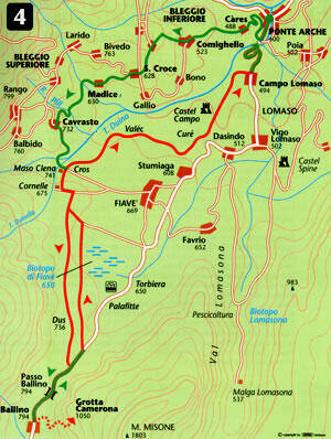 Da Ponte Arche (m 400) si sale verso S.Croce, poi si sale a Cavrasto (m 732); proseguendo verso Fiavé, alla Cros, si prende a destra la strada sterrata che porta alla località Cornelle; prima dell’abitato, dritti, si procede sulla strada sterrata per il Dus e si arriva a Passo Ballino (m 794); da qui si prosegue a destra per la strada statale arrivando al paese di Ballino dove, a sinistra, a lato della chiesa, parte la strada che porta alla grotta Camerina.
