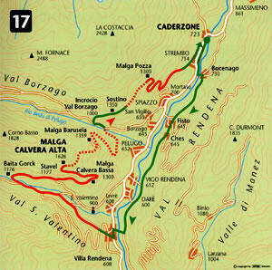 Da Caderzone (m 723) a Villa Rendena, sulla sinistra orografica del Sarca. Da Villa Rendena (m 608) si sale, inizialmente su asfalto poi per sentieri e sterrate, e si raggiunge la Baita Gorck (m 1.176) (molte le varianti di salita in Val San Valentino). Da qui a destra in piano; al bivio svoltare a sinistra in falsopiano in direzione Malga Calvera Bassa (m 1.300) da dove si prosegue a sinistra su strada forestale fino a Malga Calvera Alta (m 1.626). Ripida discesa su sentiero, poi sterrato, in Val di Borzago. Si sale a sinistra su asfalto; poi a destra per Sostino (m 1.322). A fine asfalto si prosegue diritti nel prato, poi nel bosco fino a fine sterrato e da qui per sentiero a Malga Pozza (m 1.300) dove, incontrando una strada forestale, si scende a Strembo (m 714) per proseguire a Caderzone (m 723).
