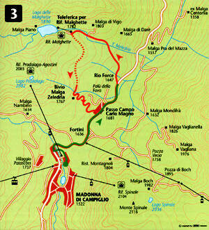 M. di Campiglio - Passo C. C. Magno - Telef. Rif. Malghette - Malga Zeledria - M. di Campiglio Caratteristiche Lunghezza: km 13 Dislivello: m 330 Tempo di percorrenza: 1.30 h Caratteristiche percorso: in bici 90% Difficoltà: facile, con divertente discesa finale Il percorso Da Madonna di Campiglio (m 1.522) salire al Passo Campo Carlo Magno (m 1.681) e seguire la strada fino al Rio Force (m 1.647). Girare a sinistra imboccando la strada delle Malghette fino alla partenza della teleferica del Rifugio Malghette (m 1.782). Svoltare a sinistra imboccando il sentiero del rifugio fino ad incrociare la strada sterrata; seguirla fino al km 8,9 - bivio per Malga Zeledria. Girare a destra per Malga Zeledria (600 m fino al km 9,6 su strada mista con diversi tratti pianeggianti da farsi a piedi). Giunti a Malga Zeledria (m 1.767) svoltare a sinistra e seguire la strada fino a Campo Carlo Magno. Raggiunta la telecabina del Grostè costeggiare il parcheggio per imboccare la strada delle Grotte fino a Madonna di Campiglio (m 1.522). |