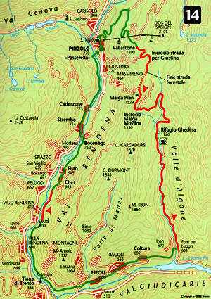 Da Pinzolo (m 770) a Vallastone per strada asfaltata prima del ponte di Carisolo (indicazioni per Pra Rodont). Da Vallastone (m 1.300) a destra in falsopiano verso l'incrocio con la strada che scende a Giustino. Da qui proseguire in piano su strada forestale fino alla fine. Prendere poi il sentiero che sale a Malga Plan (m 1.529). Poco sotto la malga, in piano, a destra; poi leggermente in salita fino all'incrocio a quota 1.550 m per scendere al Rifugio Ghedina (m 1.126), poi a Coltura (m 602). Da qui per strada asfaltata a Tione (località Sesena). Poi sempre sulla sinistra orografica del Sarca fino a Ches, Fisto, Bocenago (m 750), Strembo (m 714), Caderzone (m 723) e Pinzolo (m 770).