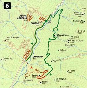 Discesa Qui finisce l'asfalto e comincia lo sterrato; percorrerlo sempre in discesa fino alla casa più bassa dei pascoli di Rango. Di fronte a questa, nella boscaglia, ha inizio il sentiero che passando dalla chiesetta di S. Lorenzo ci porterà a Condino. È un sentierino stupendo che merita però la giusta attenzione. Arrivati a Condino (m 444 ), fare ritorno alla zona artigianale di Cimego lungo la statale di fondovalle.