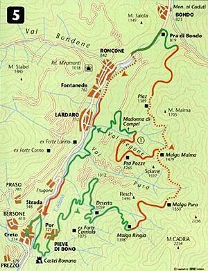 Oltrepassata la malga, continuare lungo quella che è diventata una mulattiera. All'altezza della piazzola per l'elicottero prendere il bivio sulla destra e poi sempre lungo il sentiero (attenzione perché in certi punti è stretto ed esposto).Raggiunti i pascoli di Malga Maima (m 1.479) potremo scendere direttamente a valle (variante a) oppure continuare sempre lungo il "Sentiero della Pace" e poi lungo la strada forestale fino a raggiungere l'abitato di Pra di Bondo (m 819) e da qui lungo la strada di fondovalle fare ritorno a Pieve di Bono (m 514). Varianti Da Malga Maima (m 1.479) a Lardaro (m 732) Variante che permette un più rapido ritorno a fondovalle. Percorre per intero una strada forestale.