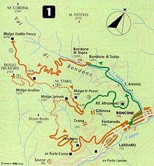 Bell'itinerario che porta a ripercorrere parte delle vecchie strade militari che si inerpicavano sulle pendici del Dosso dei Morti. A sud dell'abitato di Roncone (m 776), a latodella strada statale, si trova la zona industriale. Qui sarà possibile parcheggiare la macchina sull'ampio spiazzo sterrato. Si parte in direzione del centro dell'abitato di Roncone dove troveremo le indicazioni per il rifugio Miramonti. Al primo tornante sinistrorso della strada per il rifugio svoltare a destra con direzione Bondone di Sotto e di Sopra. La strada in questo tratto è decisamente ripida e faticosa. Giunti a Bondone di Sopra prendere la deviazione sulla sinistra (la strada comincia ad essere sterrata). Continuare lungo i numerosi tornanti fino al bivio per Malga Stablo Fresco (variante a); svoltare a sinistra e con breve traversa si arriva a Malga Avalina (m 1.970). Da qui è possibile accedere alla variante b.