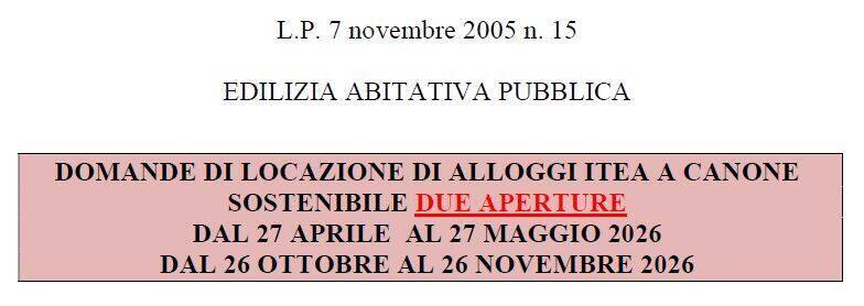Si comunica che, con delibera della Giunta Provinciale n. 387 del 20.03.2026, sono stati stabiliti due periodi di raccolta delle domande di locazione di alloggi a canone sostenibile (ITEA) dal 27 aprile al 27 maggio 2026 e dal 26 ottobre al 26 novembre 2026.