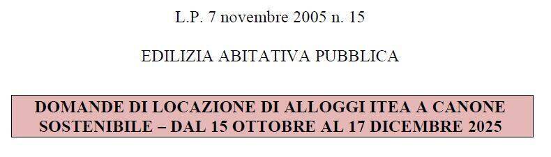 Si comunica che, con delibera della Giunta Provinciale n. 1435 del 26.09.2025, è stato stabilito dal 15 ottobre al 17 dicembre 2025 il periodo di raccolta delle domande di alloggio a canone sostenibile (ITEA).