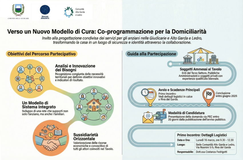 Con decreto del Presidente della Comunità delle Giudicarie n. 25 di data 11.02.2026, è stato avviato il procedimento per la co-programmazione relativo al “Sistema integrato dei servizi a sostegno della domiciliarità delle persone anziane e dei loro familiari nel territorio delle Comunità Alto Garda e Ledro e Giudicarie”.