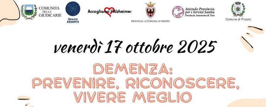 Il servizio sociale della comunità delle giudicarie, all'interno del progetto triennale "Comunità amiche delle persone con demenza", con riferimento al Piano Provinciale Demenze della XVI Legislatura, invita tutta la popolazione ad un incontro informativo sul tema della demenza e dell'alzheimer tenuto dal medico neuroradiologo Nivedita Agarwal. L'evento si terrà venerdì 17 ottobre presso il Paladolomiti di Pinzolo dalle ore 20.30.